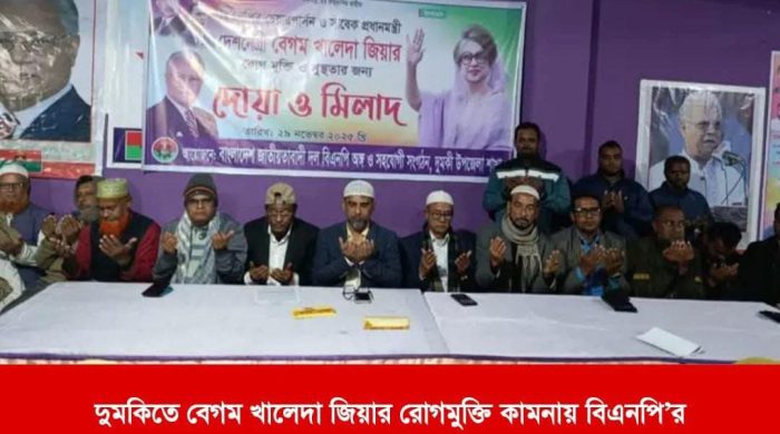 জাকির হোসেন হাওলাদার, দুমকী( পটুয়াখালী) প্রতিনিধি : বাংলাদেশ জাতীয়তাবাদী দল (বিএনপি)-এর চেয়ারপার্সন ও সাবেক প্রধানমন্ত্রী দেশনেত্রী বেগম খালেদা জিয়ার আশু রোগমুক্তি ও সুস্বাস্থ্য কামনায় পটুয়াখালী জেলার দুমকি উপজেলায় দোয়া ও মিলাদ অনুষ্ঠিত হয়েছে। শনিবার (২৯ নভেম্বর) সন্ধ্যা ৮টায় বাংলাদেশ জাতীয়তাবাদী read more