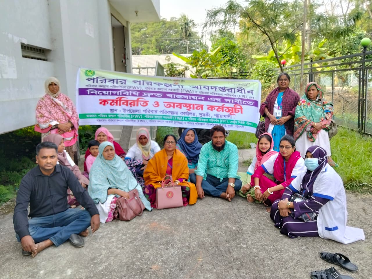 পরিবার কল্যাণ সহকারী (FWA) দের নিয়োগবিধি দ্রুত বাস্তবায়নের দাবিতে পটুয়াখালী জেলার দুমকি উপজেলায় কর্মবিরতি ও অবস্থান কর্মসূচি অনুষ্ঠিত হয়েছে।বুধবার (৩ ডিসেম্বর) সকাল ১০টায় উপজেলার পরিবার পরিকল্পনা কার্যালয় চত্বরে পরিবার কল্যাণ সহকারী ও পরিদর্শকবৃন্দের উদ্যোগে এ কর্মসূচি পালিত হয়। কর্মসূচিতে অংশগ্রহণকারীরা জানান, দীর্ঘদিন ধরে ঝুলে থাকা নিয়োগবিধি বাস্তবায়নের বিষয়টি অত্যন্ত জরুরি।