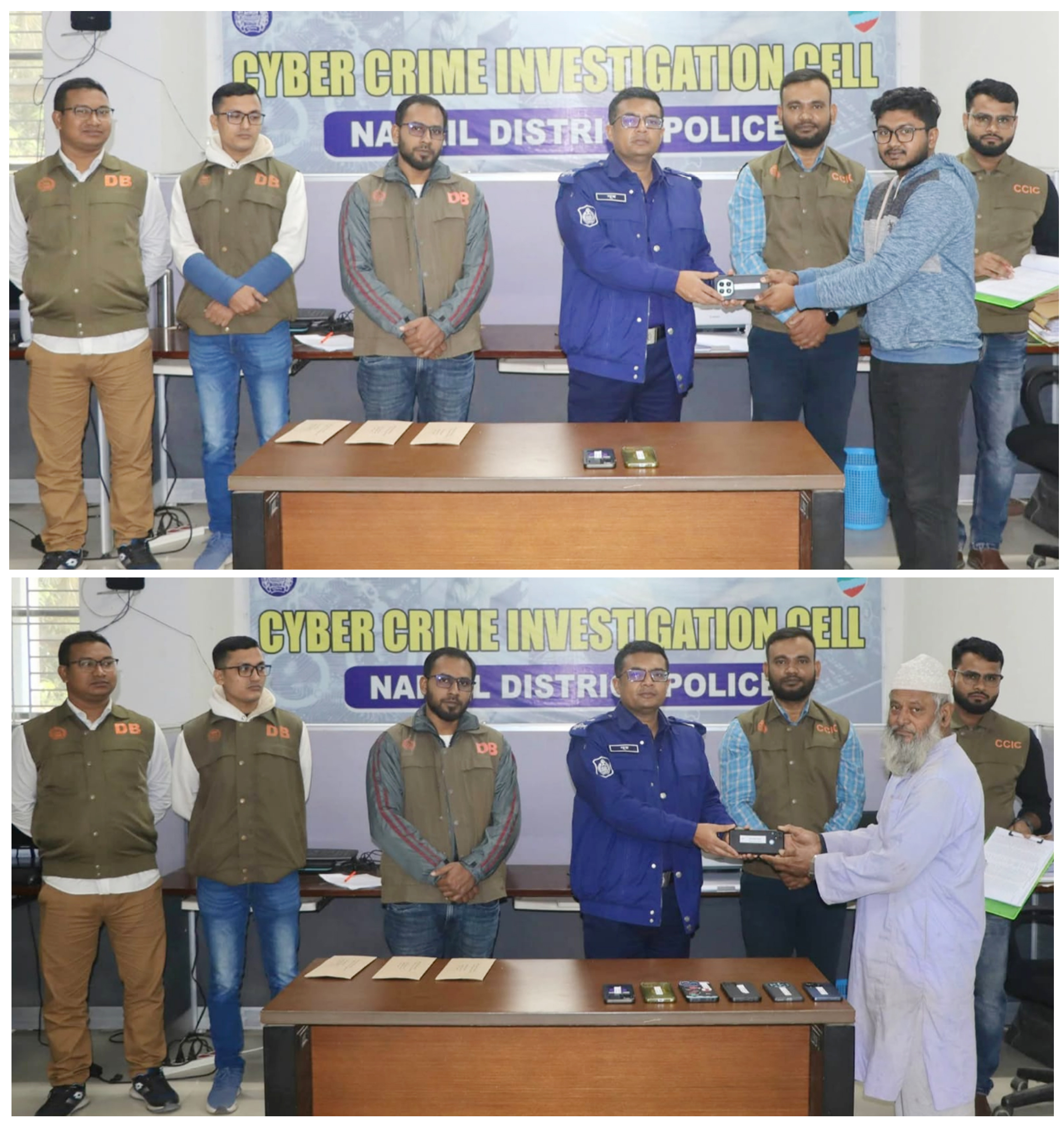 নড়াইলে সিসিআইসি কর্তৃক হারিয়ে যাওয়া ২৬টি মোবাইল ও নগদ টাকা উদ্ধার মালিকদের নিকট হস্তান্তর। নড়াইল জেলা পুলিশ সুপার মোহাম্মদ আল মামুন শিকদার'র প্রত্যক্ষ দিকনির্দেশনায় সাইবার ক্রাইম ইনভেস্টিগেশন সেল (CCIC) উদ্ধার কার্যক্রম অব্যাহত রেখেছে। উজ্জ্বল রায়, নড়াইল জেলা প্রতিনিধি জানান, সাইবার ক্রাইম ইনভেস্টিগেশন সেলে কর্মরত চৌকস অফিসার এসআই (নিঃ) মোঃ জয়নুল আবেদীন, এসআই (নিঃ) মোঃ রাকিবুল হাসান ও এসআই (নিঃ) আলী হোসেনসহ অন্যান্য পুলিশ সদস্যরা তথ্য প্রযুক্তি ব্যবহারের মাধ্যমে নড়াইল জেলার ৪টি থানা এলাকায় হারিয়ে যাওয়া মোবাইল ফোন ও অনলাইন প্রতারণার মাধ্যমে খোয়া যাওয়া টাকা উদ্ধার করে থাকে। এরই ধারাবাহিকতায় নভেম্বর মাসে ছাব্বিশ টি হারানো মোবাইল ও বিভিন্নভাবে অনলাইন প্রতারণার মাধ্যমে খোয়া যাওয়া ৯২,০০০/- টাকা উদ্ধার করা হয়। অদ্য মন্গবার (২৩ ডিসেম্বর) সকাল দশটার সময় সাইবার ক্রাইম ইনভেস্টিগেশন সেল কর্তৃক উদ্ধারকৃত বিভিন্ন মডেলের ২৬(ছাব্বিশ) টি স্মার্ট ফোন ও অনলাইন প্রতারণা মাধ্যমে খোয়া যাওয়া ৯২,০০০/- টাকা জনাব নূর-ই আলম সিদ্দিকী, অতিরিক্ত পুলিশ সুপার, (প্রশাসন ও অর্থ) নড়াইল আনুষ্ঠানিকভাবে ভুক্তভোগীদের নিকট হস্তান্তর করেন।